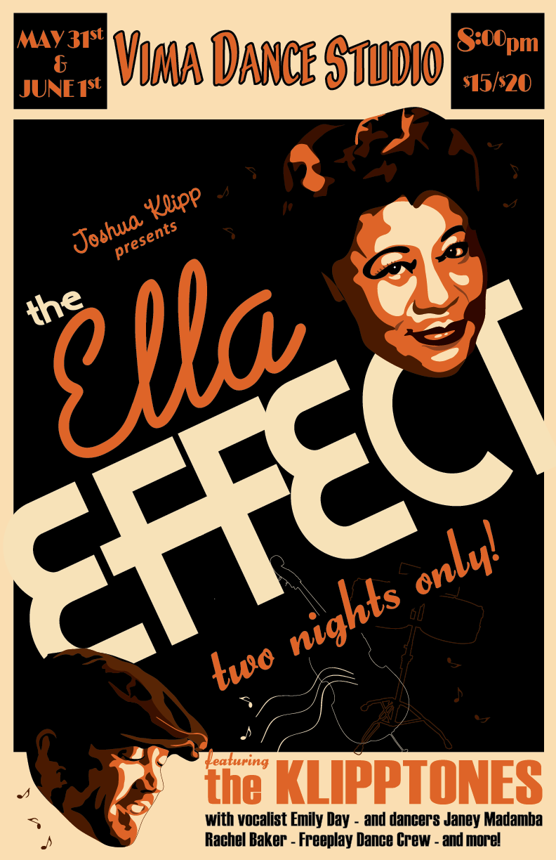 Promotional poster for "The Ella Effect," a full-length show put on by Freeplay Dance Crew. Based on a famous Chick Webb poster, below.